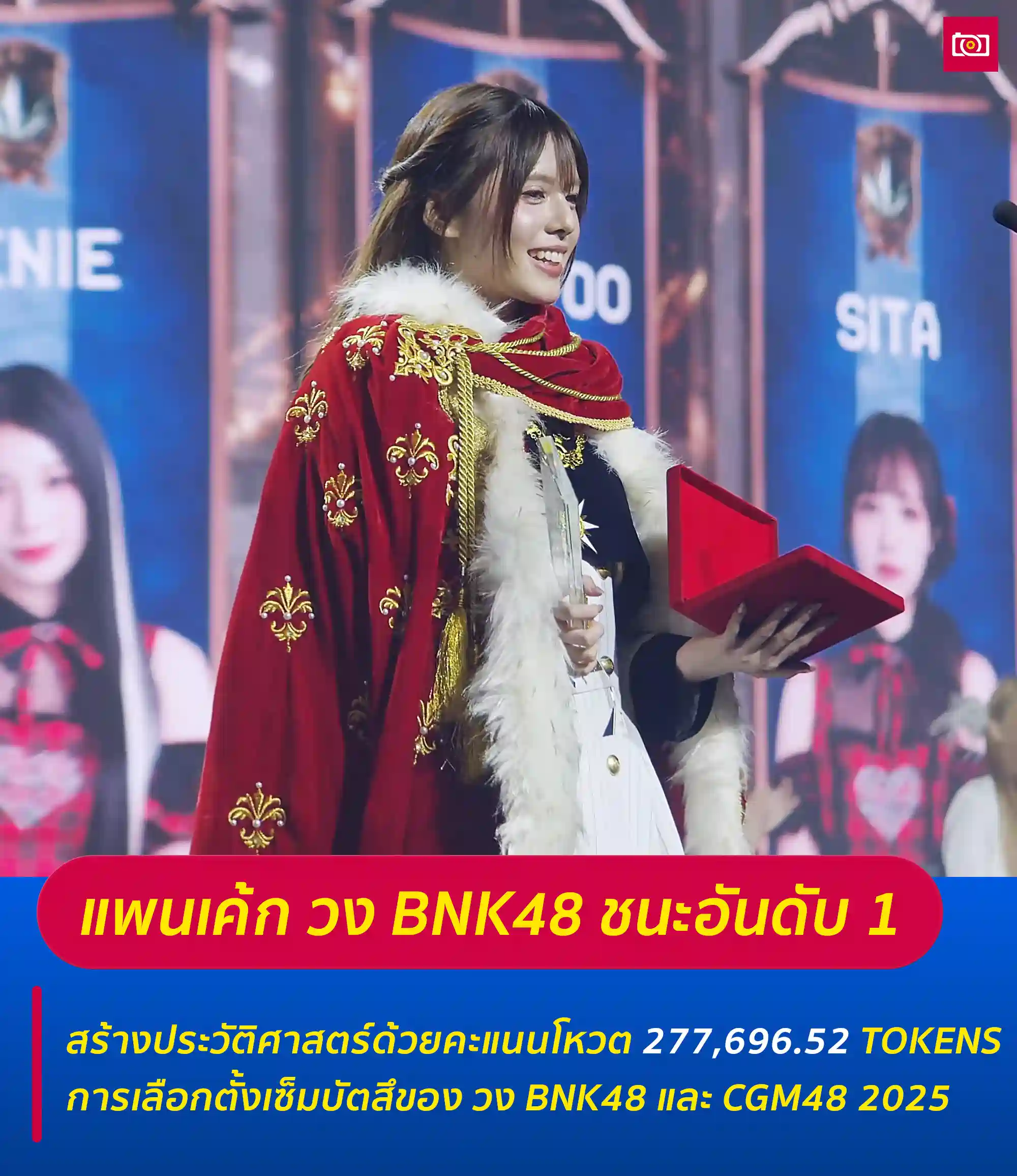 แพนเค้ก BNK48 คว้าอันดับ 1 การเลือกตั้ง BNK48 & CGM48 GE2025 ด้วยคะแนนถล่มทลาย และเป็นการสร้างประวัติศาสตร์ 48Group ที่ทำคะแนนโหวตสูงสุดตลอดกาล ด้วยคะแนนสูงสุด 277,696.52 TOKENS