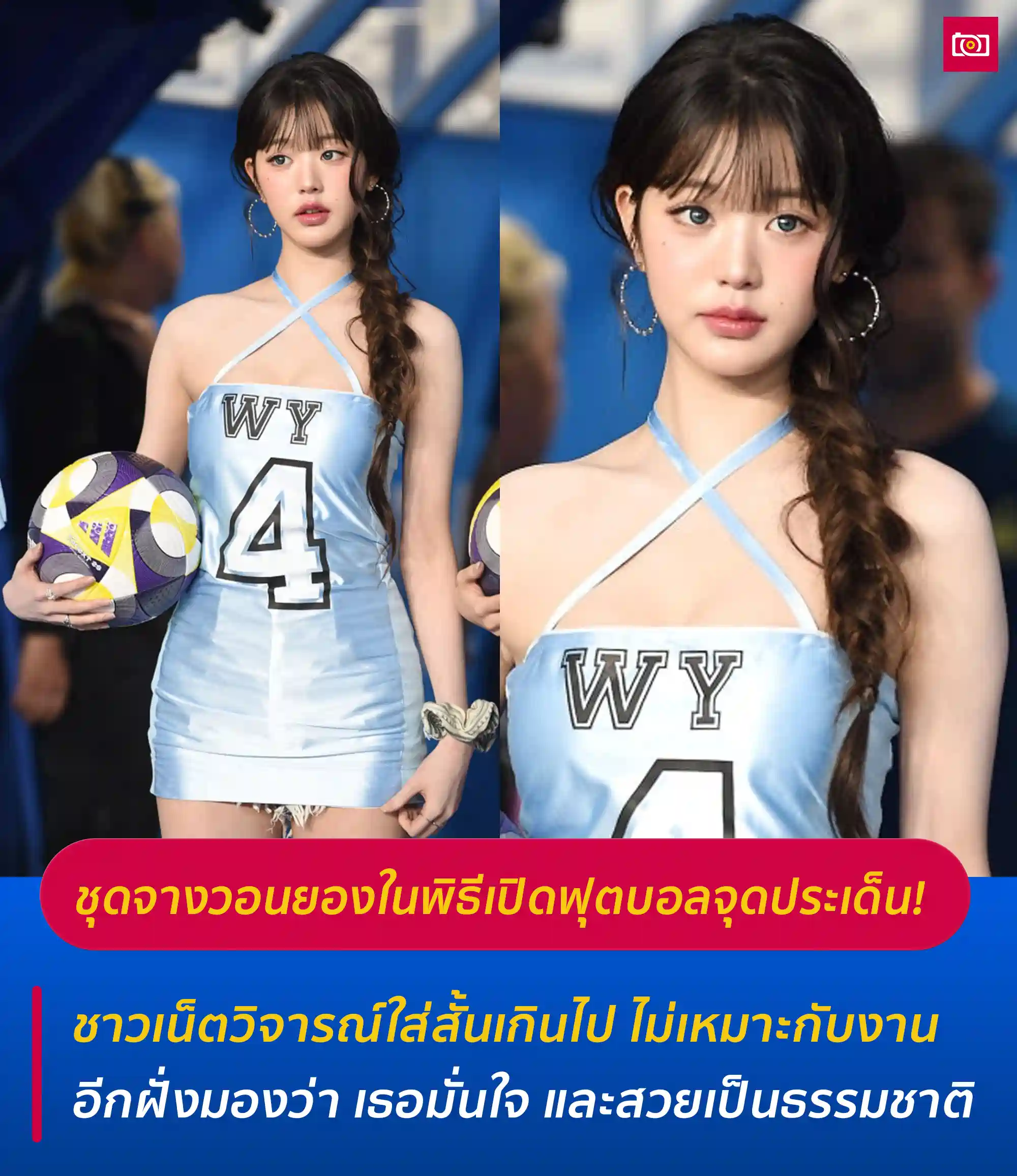 จางวอนยอง สมาชิกวง IVE เผชิญข้อโต้แย้งเรื่องเครื่องแต่งกายในพิธีเปิดการแข่งขันฟุตบอล หลังชุดที่ดัดแปลงจากชุดฟุตบอลถูกวิจารณ์ว่าเปิดเผยและไม่เหมาะสมจากแฟนคลับและชาวเน็ตบางส่วน